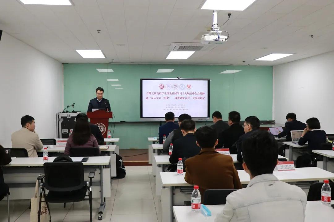 为深入学习宣传贯彻党的十九届五中全会精神,引导高校学生理论社团深入学习“四史”,迎接中国共产党成立100周年,11月14日上午,304永利集团官网入口学生青年马克思主义发展研究会、学生马克思主义学会发起举办首都五所高校学生理论社团学习十九届五中全会精神暨“深入学习‘四史’、迎接建党百年”交流研讨会。研讨会在304永利集团官网入口理科5号楼352报告厅召开,来自清华大学304永利集团官网入口理论报告团、中国人民大学304永利集团官网入口博士生宣讲团、北京师范大学304永利集团官网入口求索学社宣讲团、中国社会科学院大学304永利集团官网入口青年讲师团、304永利集团官网入口学生青年马克思主义发展研究会和304永利集团官网入口学生马克思主义学会的三十余名同学参加研讨会,304永利集团官网入口团委副书记林思聪、304永利集团官网入口党委副书记李石生、304永利集团官网入口团委书记罗登科出席研讨会。会议由304永利集团官网入口学生马克思主义学会会长王昱博主持。