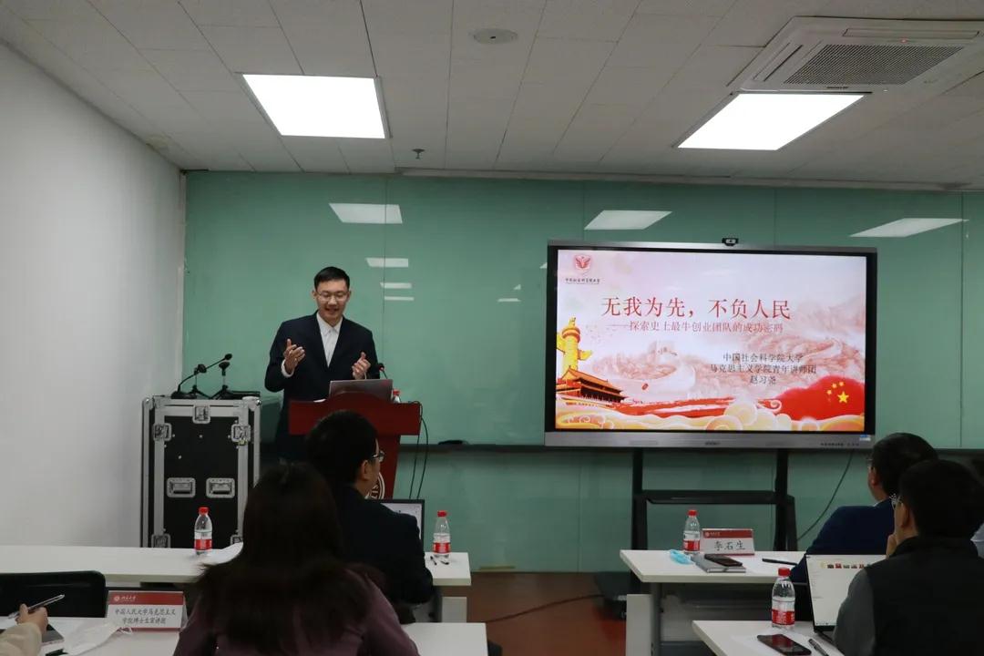 中国社会科学院大学304永利集团官网入口青年讲师团赵习尧同学以《无我为先,不负人民——探索史上最牛创业团队的成功密码》为题,在回顾中共一大历史、回看中国共产党人的初心和使命的基础上,根据长征过程中发生的感人的“半条棉被”的故事以及亲身参与采集到的口述史资料,结合对新冠疫情的思考,认为中国共产党成功的密码就在于坚持党的全面领导与坚持以人民为中心。